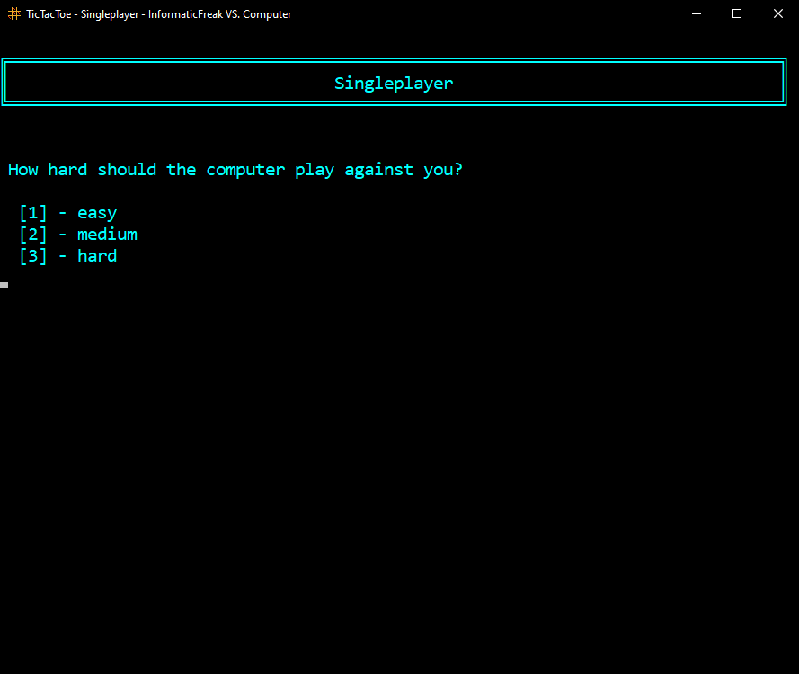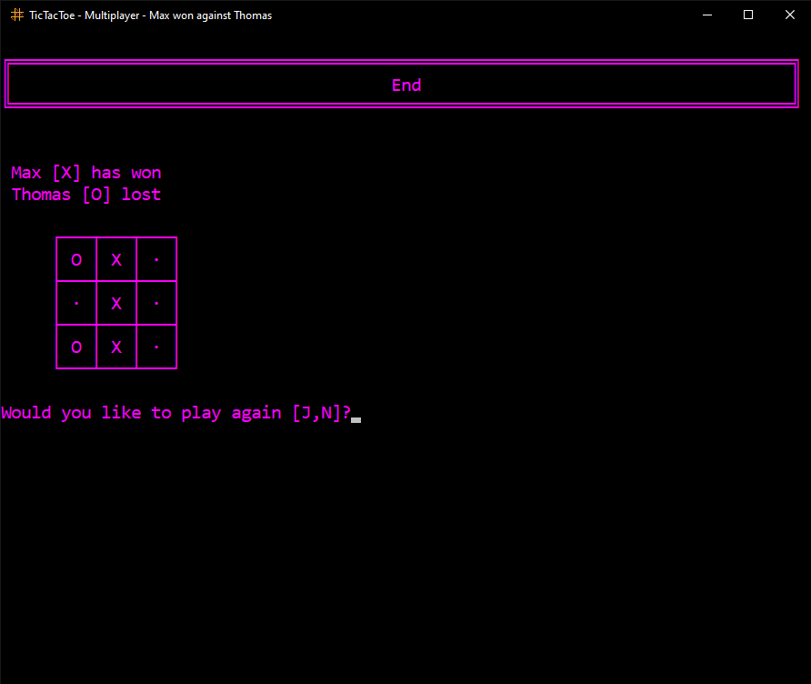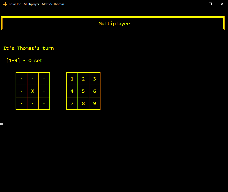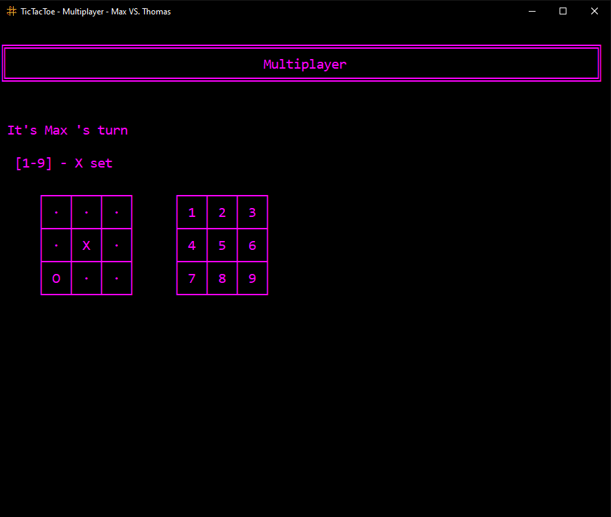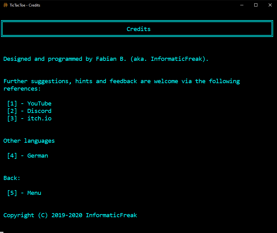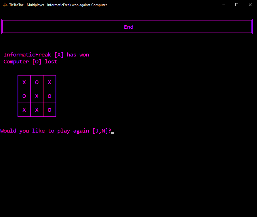 Tags | 2D, 8-Bit, Arcade, ascii, console-based, Local multiplayer, Retro, Short, Singleplayer, tic-tac-toe |